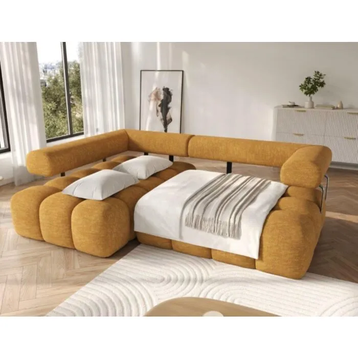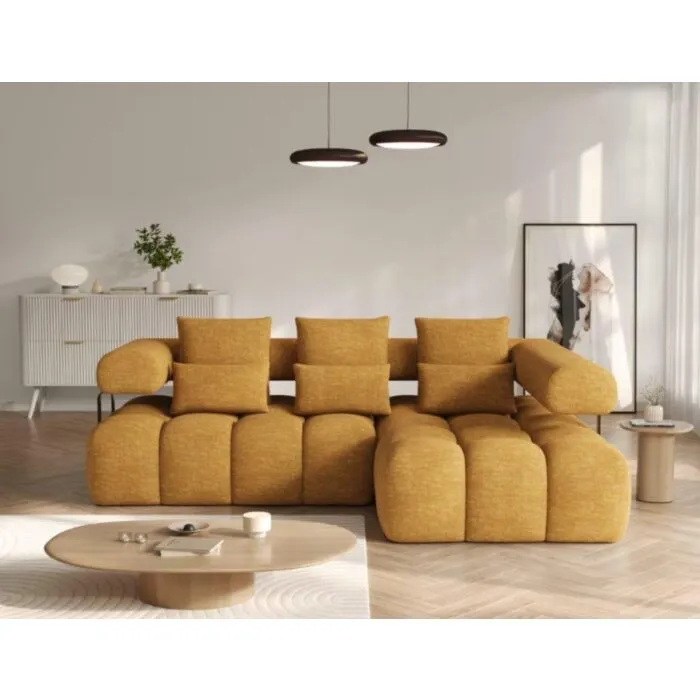 Kotna sedežna garnitura SABRINA je sodoben in funkcionalen kos pohištva, zasnovan z mislijo na vsakodnevno udobje in notranjo estetiko. Vzmetena z valovitimi vzmetmi. Kotna sedežna garnitura ima praktično spalno funkcijo, ki vam omogoča, da jo hitro spremenite v udoben prostor za nočni počitek. Ima električni pomik sedišča. Zahvaljujoč oblazinjenemu naslonjalu lahko pohištvo prosto postavite kamor koli v dnevni sobi, ne da bi ga bilo treba premikati ob steno, kar omogoča večjo fleksibilnost pri razporeditvi prostora. Črne plastične noge dopolnjujejo celoto in poudarjajo njen sodoben, minimalističen značaj.