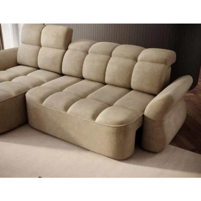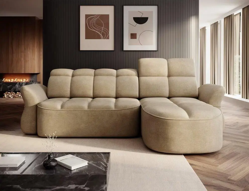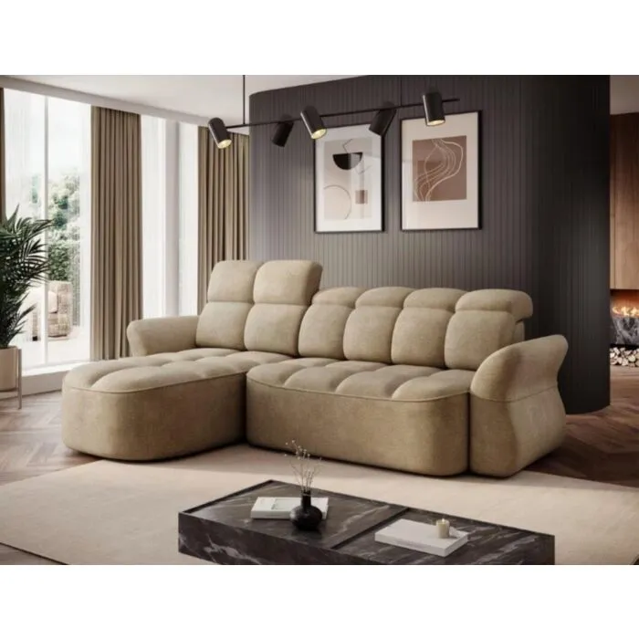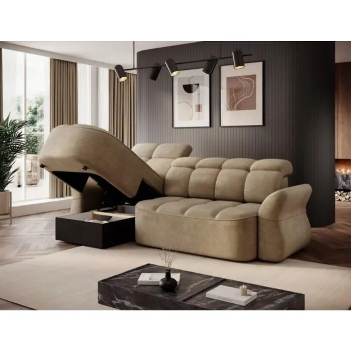 Kotna sedežna garnitura TANJA je modernega dizajna. S svojim elegantnim videzom se bo podala v vsak prostor. Sedežna je praktična za uporabo saj ima električni pomik sedišča, ter vsebuje zaboj za shranjevanje. Garnitura TANJA nudi udobje, s svojo mehko tkanino ter nastavljivimi vzglavniki. Vzmetena je z valovitimi vzmetmi.