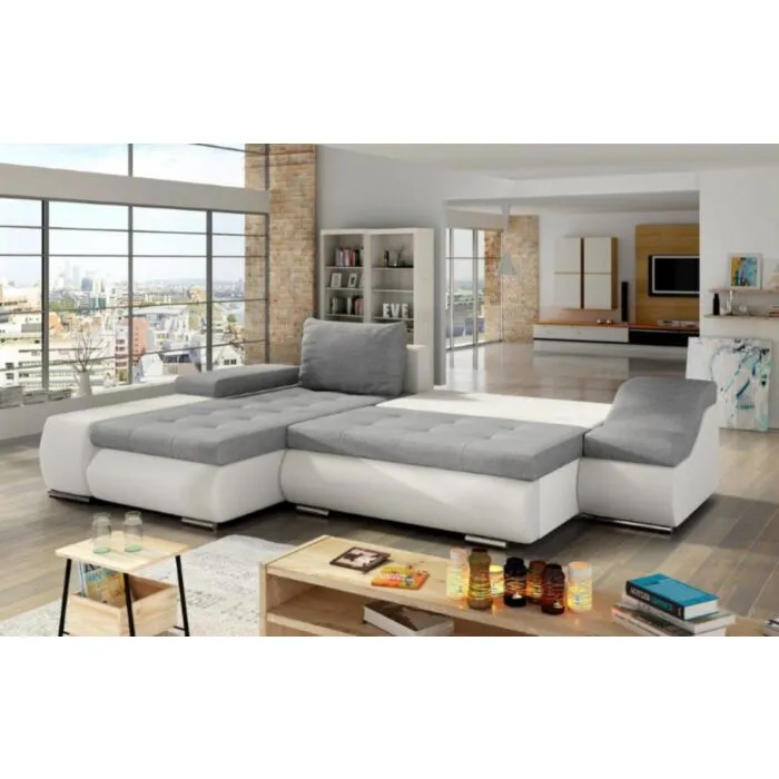 Kotna sedežna garnitura TARIK 2 je odlična garnitura po odlični ceni. Narejena v kombinaciji umetnega usnja in blaga na voljo v več barvnih kombinacijah. Garnitura ima levi ali desni kot, katerega morate izbrati. Garnitura se raztegne tudi v posteljo ter vsebuje zaboj za shranjevanje vaših stvari. Sedežna je vzmetena z valovitimi vzmetmi.