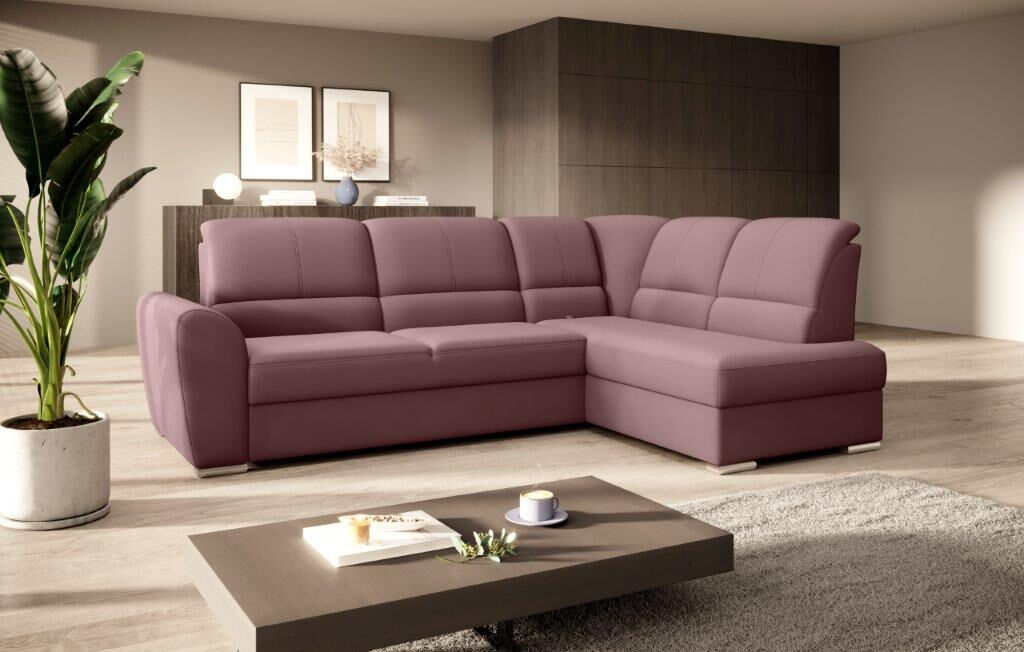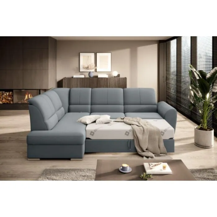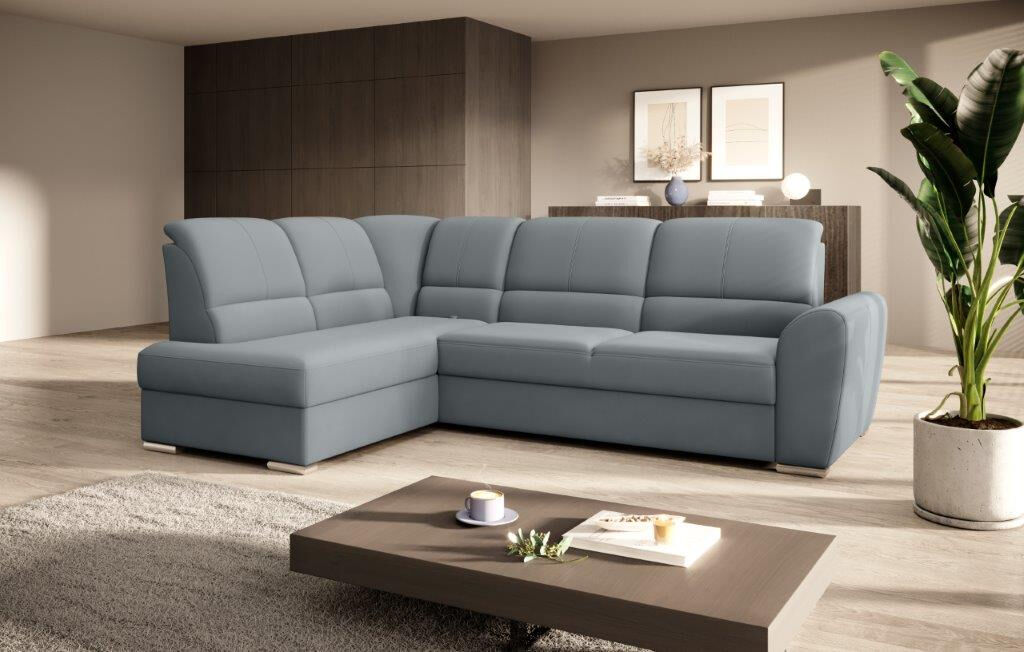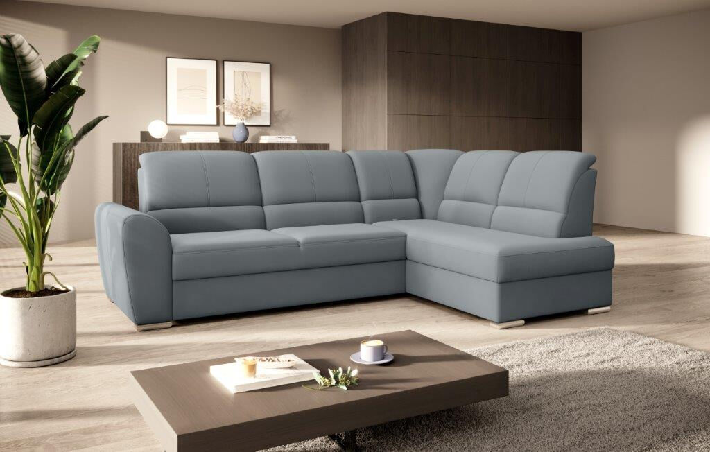 Kotna sedežna garnitura VALLY 3 je sodobnega dizajna. Sedežna je praktična za uporabo, saj ima nastavljiv sredinski naslon za hrbet. Ima elegantne srebrne noge, zaboj za shranjevanje ter se raztegne v dodatno ležišče z mehanizmom delfin. Sedežna je vzmetena z valovitimi vzmetmi v kombinaciji poliuretanske pene.
