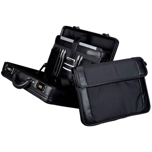 Eleganten ataše kovček iz imitacije usnja in najlona, raztegljiv z dvema številčnima ključavnici. Notranjost vključuje ovitek za prenosnik (15″), zanke za pisala, predale za dokumente in žepke za vizitke. Zunanje dimenzije: 43 x 30 x 10 (+2) cm.
