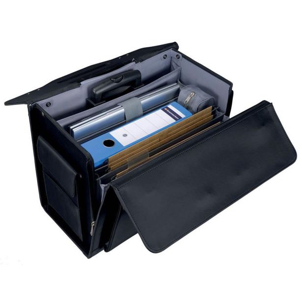 Eleganten pilotski kovček na teleskopskih kolesih, razširljiv z dvema stranskima zadrgama. Ima tri dodatne predalčke, predal za prenosni računalnik, dva zunanja žepka in dve ključavnici. Zunanje dimenzije: 46 x 39 x 27 cm. Višina vozička: cca. 105 cm.
