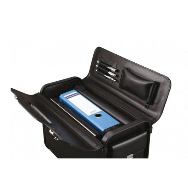 Eleganten pilotski kovček iz imitacije usnja z dvema številčnima ključavnici. Ima sprednji in stranski žep, velik glavni predal, etui z zadrgo ter tri zanke za pisala. Zunanje dimenzije: 46 x 35 x 21 cm, notranje dimenzije: 41 x 30 x 14 cm.