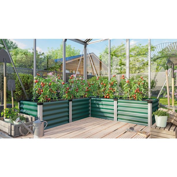 Dvignjene gredice Vitavia iz serije In&Out ponujajo rahlo dvignjeno delovno površino zahvaljujoč svoji višini 40 cm – tako da lahko tudi globoko ukoreninjene rastline najdejo dovolj zemlje, da se dobro oprimejo in dobijo dovolj hranil. Ciljno plastenje tal lahko optimizira pogoje tal. Format gredic In&Out je prilagojen standardnim širinam rastlinjakov Vitavia, tako da se optimalno prilegajo na zadnji konec ali – v obliki črke L (velikost M) – v zadnji kot rastlinjakov. Tabela (glej spodaj) nudi pregled primernih formatov za standardne modele rastlinjakov. Ležišča In&Out, izdelana iz izjemno odpornega na vremenske razmere Zincalume, so prav tako primerna za uporabo na prostem. V nasprotju z lesenimi posteljami ne potrebujejo notranje folije. Linus IN&OUT je na voljo v treh velikostih: S, M in L, kjer je M v obliki črke L, drugi dve pa imata klasično pravokotno obliko. Nove dvižne gredice IN&OUT v barvi granit ali morska trava v kombinaciji z delikatnimi aluminijastimi profili (opcijsko eloksiranimi v aluminiju ali črno prašno lakiranimi) se diskretno zlijejo s skoraj vsakim rastlinjakom Vitavia in modernim vrtom. Posamezni moduli, vključeni v komplet, so vnaprej izrezani in povezovalni deli so predhodno izvrtani.
