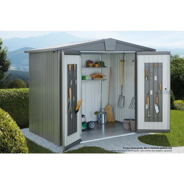 Zanesljiva že desetletja in še vedno zelo priljubljena. Vrtna hiška “Evropa” je prodana v 150.000 kosih in ponosni uporabniki jo z veseljem uporabljajo. Razlogi za to so visoka stabilnost, trpežni materiali in minimalno vzdrževanje. Funkcionalna oprema olajša delo in priskrbi za red vašemu vrtu. Obsežna osnovna oprema in premišljena dodatna oprema izpolnita vse želje.Odlikuje jo visoka stabilnost, trpežni materiali, brez potrebnega vzdrževanja. Funkcionalna oprema olajša delo in priskrbi red. Obsežna osnovna oprema in premišljena dodatna oprema izpolnita vse želje. Dimenzije vrtne hiške so bruto zunanje mere z vključenim previsom strehe. Natančne mere hišk in tehnični podatki so dostopni na spletni strani dobavitelja.