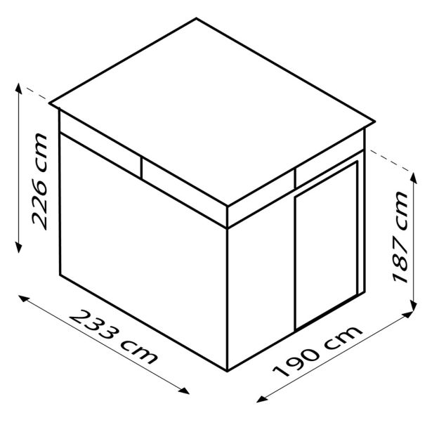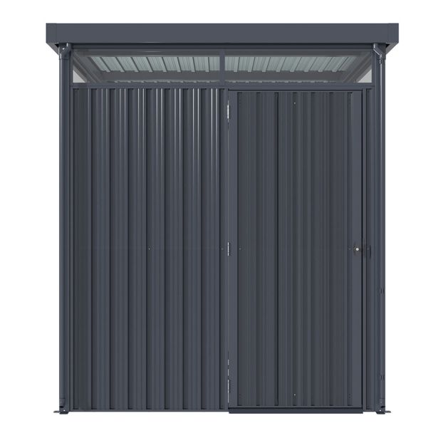 Stranice, ki so visoke preko 2 m, omogočajo večini uporabnikov enakomerno stoječo višino v območju gibanja skladišča za orodje. Stene, streha in deli talnega okvirja iz pocinkane jeklene pločevine so zanesljivo zaščiteni pred rjo in praskami z dodatnim premazom iz poliestra. Nihajna vrata, ki se odpirajo navzven, dajejo hiši domač značaj in prihranijo prostor v notranjosti. Pomična streha, ki je na voljo tudi kot komplet z Rheinfeldenom, ustvari dodaten prostor za shranjevanje. Razširi pokrito površino za dodatnih 6,63 m2: kot nalašč za kolesa in vse stvari, za katere sta suh prostor in hiter dostop enako pomembna.
