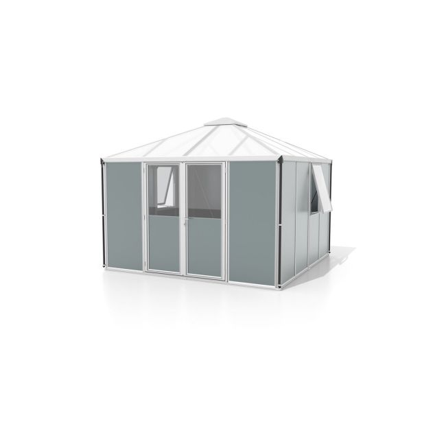 Visokokakovosten skladiščni prostor ponuja popolno mešanico diskretnosti, estetike in dnevne svetlobe. Robustni in fini obenem tvorijo tanek okvir vijačeni dvojni okvirni profili iz eloksiranega ali prašno lakiranega aluminija. V strehi je obložen z UV-prevlečenimi votlimi stenskimi ploščami, ob straneh s stabilnimi aluminijastimi sendvič ploščami v mat žajbelj sivi barvi in ??stranskimi okni iz kristalno čistega varnostnega stekla (ESG).