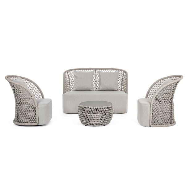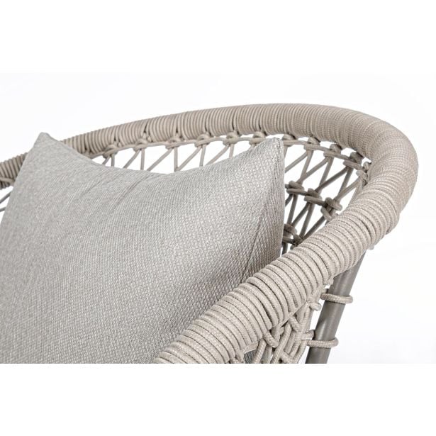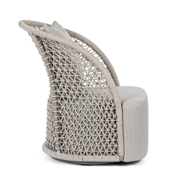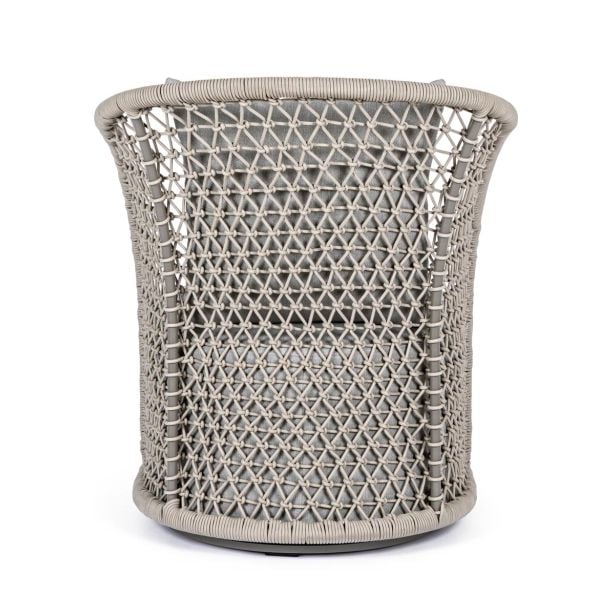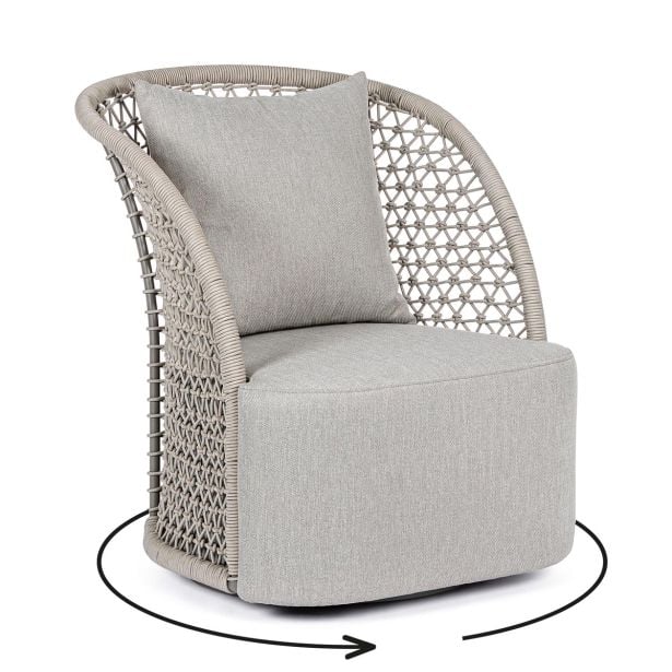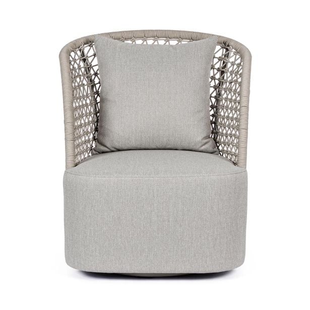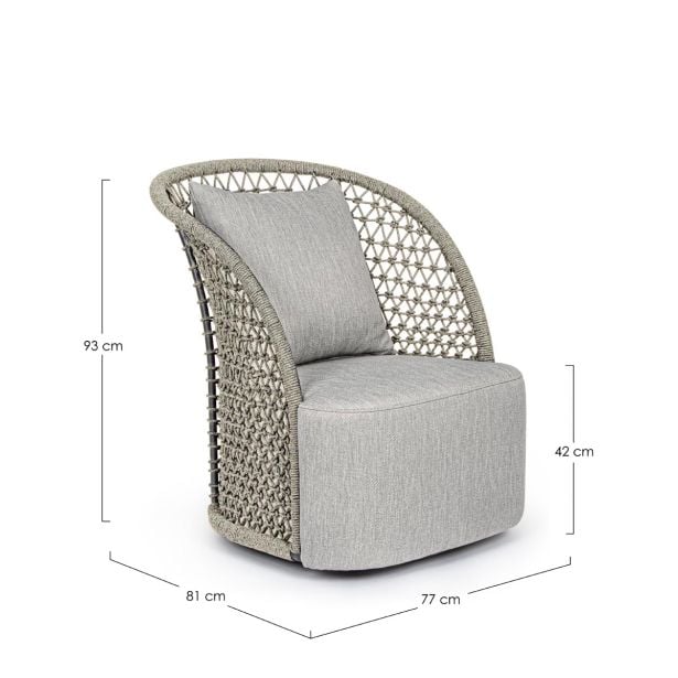 Bizzotto Homemotion Cuyen je fotelj rustikalnega dizajna s sodobnim pridihom. Struktura je iz aluminija peščene barve, prekritega z olefinsko vrvjo, sedež pa je iz blaga. Ta fotelj je idealno dopolnilo za stilsko opremljanje zunanjega okolja. Njegova trdna in lahka aluminijasta struktura se zlije s tkanjem olefinske vrvi, kar daje okolju etnični pridih. Rezultat je edinstvem in sodoben slog, ki ukrade pogled. Ukrivljenost naslonjala omehča obliko, zaradi česar je mehka in prijetna na pogled. Plus: fotelj je vrtljiv.
