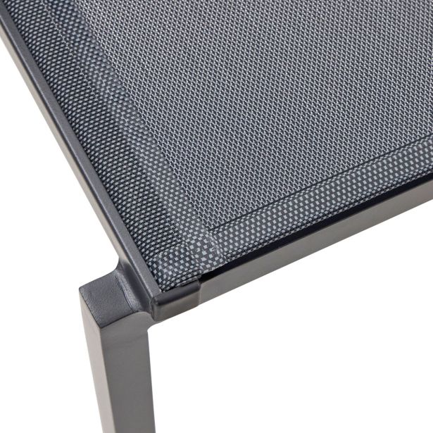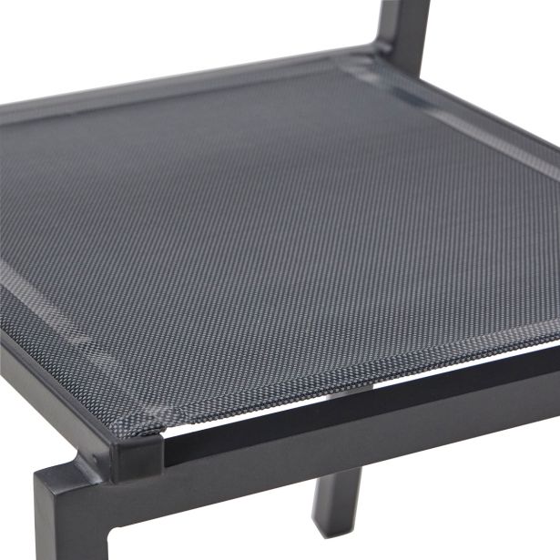 Zložljiv stol – aluminijast okvir, prašno premazan, 2×2 tekstilen, brez blazine, brez okovja, brez naslonov za roke. Antracitna barva, z likanim tekstilenom. Ovitek iz kraft papirja, 27 kosov na kupu.