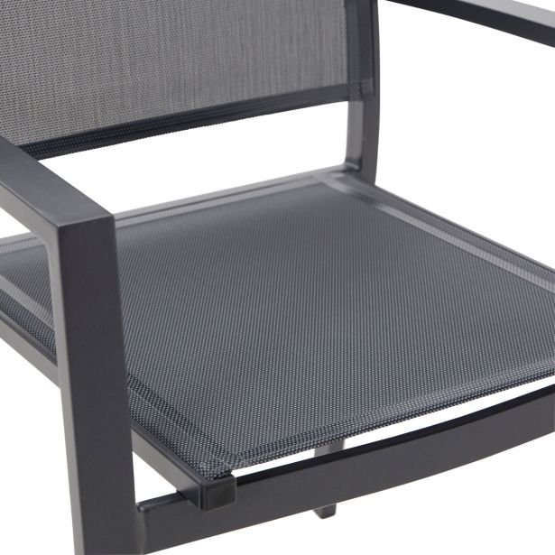 Zložljiv naslonjač – aluminijast okvir, prašno premazan, 2×2 tekstilen, brez blazine, brez okovja. Antracitna barva, z likanim tekstilenom. Ovitek iz kraft papirja.