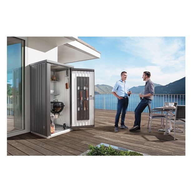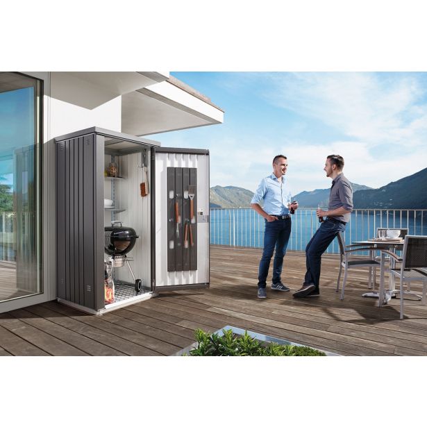 LEPA OMARA ZA VSESTRANSKO UPORABOKjer je prostor tesen, pokaže svojo prvovrstnost. Na vrtu, terasi, v garaži ali na balkonu varuje in ureja, ne da bi omejila življenjski prostor. V omaro za orodje Biohort lahko pospravite vrtne naprave, orodje, igrače ipd., kjer so zaščitene pred deževnico in krajo. Zaradi kompaktne velikosti in njene elegantne zasnove se skladno ujema z okolico.