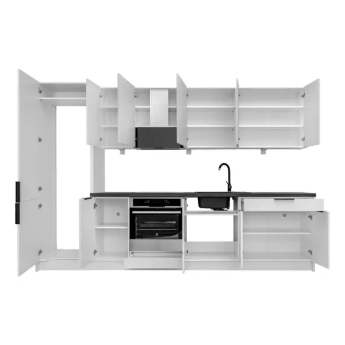 Kuhinjski blok JAGODA bela 300 cm + NAPA je modernega dizajna v beli mat barvi. Stranice so narejene iz laminirane plošče debeline 16 mm, fronte pa debeline 18 mm. Kuhinja vsebuje ABS robove 0,8 mm ter mehko zapiranje. Predal je kovinski.Spodnje omarice imajo plastične nogice višine 10cm, ki so nastavljive na +/- 2,5 cm. Ročaji so metalni v črni barvi. Pult (po želji) je debeline 38 mm katerega barvo lahko izberete. Vrstni red kuhinjskih elementov je lahko poljuben.