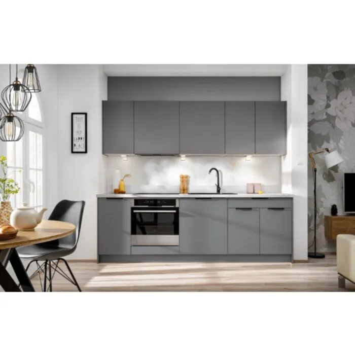 Kuhinjski blok JAGODA 240 cm z vgradnimi aparati, je modernega dizajna v sivi mat barvi. Stranice so narejene iz laminirane plošče debeline 16 mm, fronte pa debeline 18 mm. Kuhinja vsebuje ABS robove 0,8 mm ter mehko zapiranje. Predal je kovinski.Spodnje omarice imajo plastične nogice višine 10cm, ki so nastavljive na +/- 2,5 cm. Ročaji so metalni v črni barvi. Pult je debeline 38 mm v beli barvi, videz marmorja. V ceno sta vključeni 2 x dodatni spodnji stranski zaključni stranici, kakor na sliki.