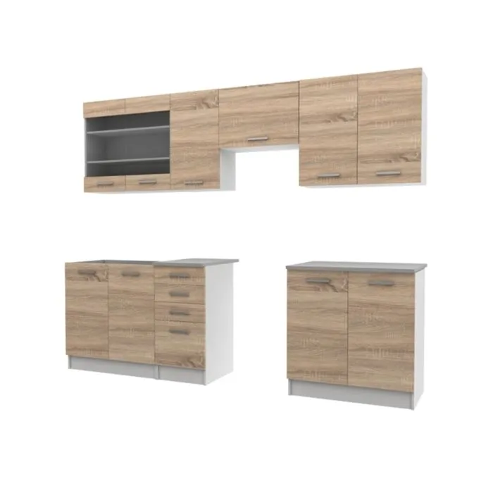 Kuhinjski blok LAVA 240 cm je dobavljiva v sonoma/beli barvi. Korpusi so iz laminirane plošče debeline 18 mm. Vrata steklene viseče omarice so iz kaljenega stekla. Kuhinja ima ABS rob. Ročaji so iz pvc-ja.