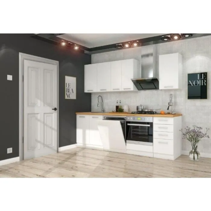 Kuhinjski blok STELLA 240 cm z vgradnimi aparati je izdelana iz oplemenitenih ivernih plošč debeline 16 mm, oblečena v dekor, kateri jo ščiti pred vlago in ima visoko odpornost na praske. Dobavljiva je v beli barvi. Debelina delovnega pulta je 28 mm. Kuhinjski blok STELLA z vgradnimi aparati je klasičnega videza, zato se bo prilegla v vsako kuhinjo.