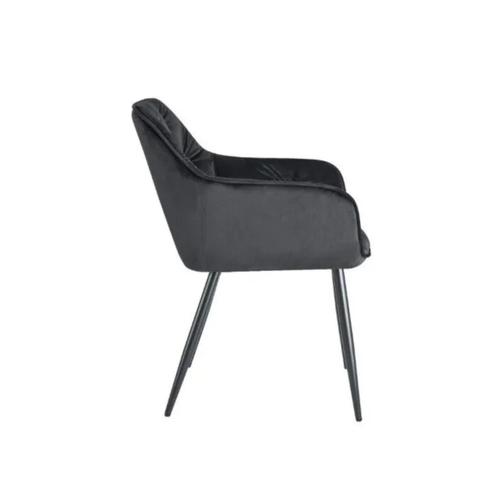 Kuhinjski stol ADO 2 velvet črn je izdelan iz visoko kakovostne tkanine velvet. Močna stabilna kovinska konstrukcija mu zagotavlja vzdržljivost ter stabilnost. Sedež in naslon sta oblazinjena z velvet tkanino, nameščena na močne črne mat kovinske noge, ki so prašno barvane z debelino profila 1,2 mm. Prav tako je naslon v notranjosti okrašen z gostimi prešiti vzorci, ki zagotavljajo moderen izgled. Dodatno udobnost mu zagotavljata naslona za roke, ki sta prav tako prešita z vzorci in ustvarita eleganten izgled.