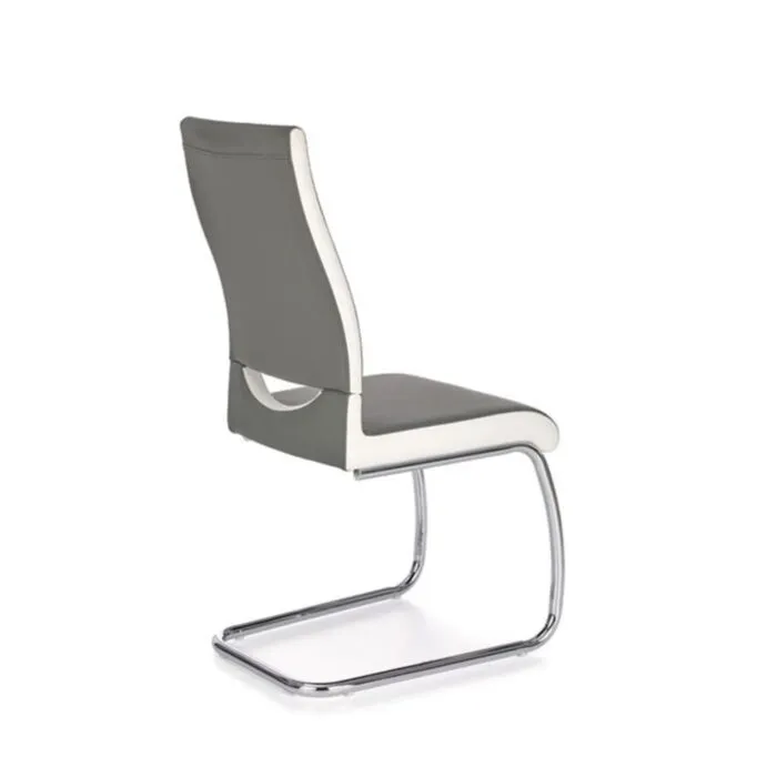 Kuhinjski stol ELMO je kvaliteten in stilski stol, ki bo polepšal vaš jedilni prostor. Podnožje stola je narejeno iz kovine v krom barvi. Sedalni del je mehek in udoben saj je oblazinjen v umetno usnje sive barve, s stranskim detajlom bele barve.