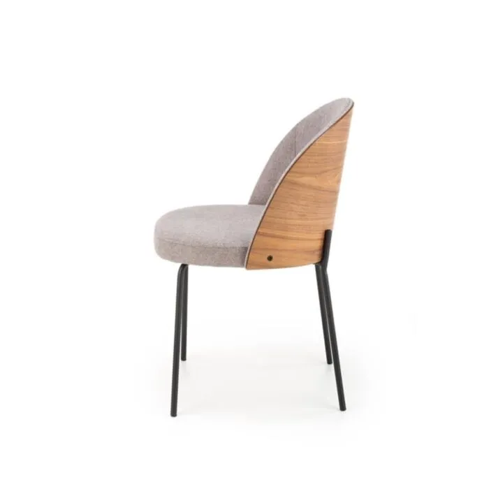 Kuhinjski stol JASPER1 je stol, ki združuje retro in sodobni stil. Kombinacija lesa in tkanine na kvalitetnem ogrodju vas bo prepričala. Nogice so izdelane iz kovine v črni barvi. Prednji del stola je oblečen v sivo blago, hrbtni del pa je iz upognjene vezane plošča, furnirja.
