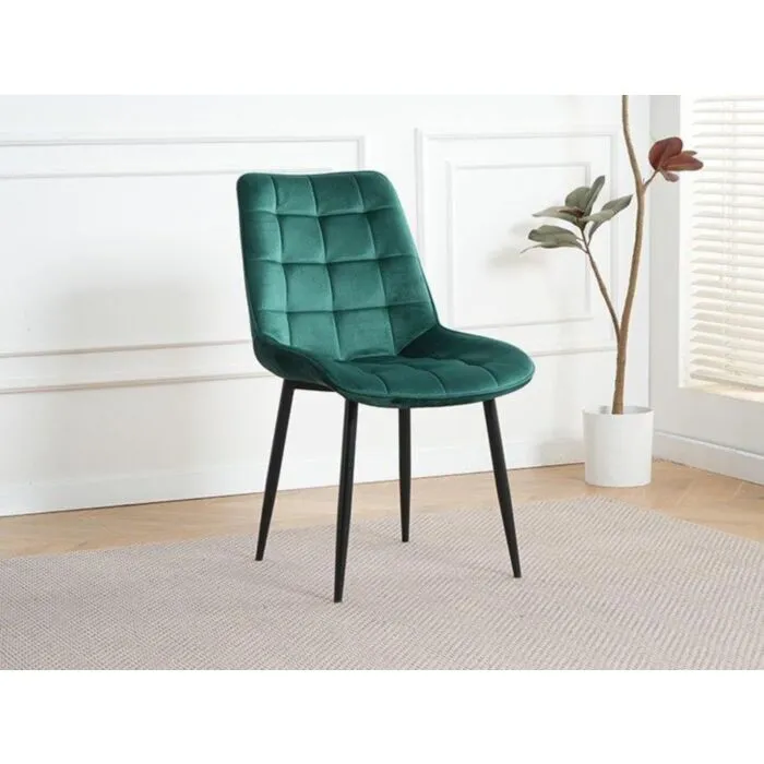 Kuhinjski stol LARA velvet zelena je odlična rešitev za kombiniranje v minimalističen ali industrijski stil prostora. Kombinacija zelenega prešitega blaga s črnimi kovinskimi nogami ustvari eleganco in lahkotnost. Noge so prašno barvane z debelino profila 1,2 mm. Profiliran naslon omogoča optimalen položaj sedenja ter udobje. Prešiti vzorec pa okrepi tkanino oblazinjenja in ustvari dodatno eleganco.