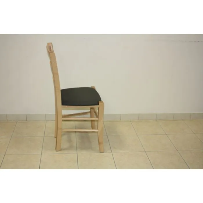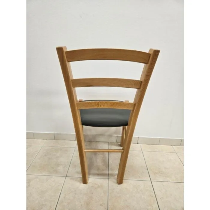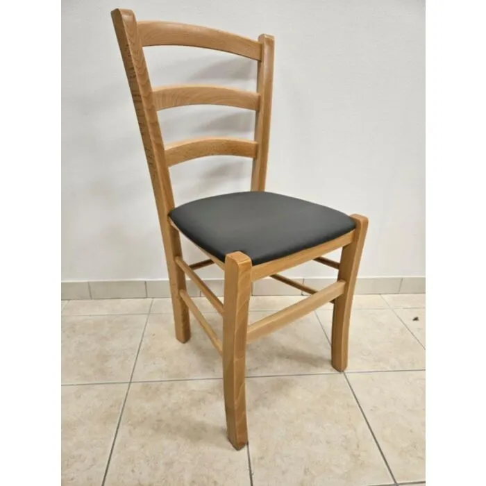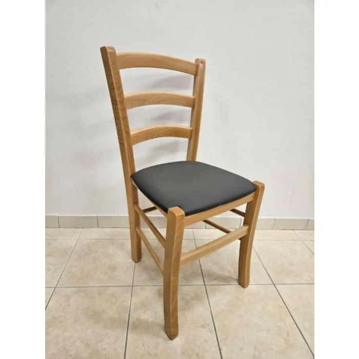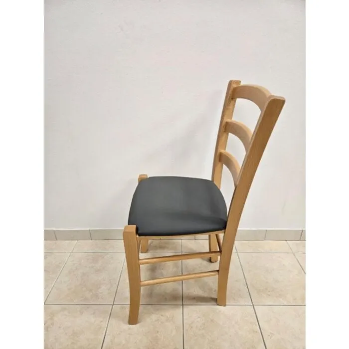 Kuhinjski stol VENEZIA je izdelan iz kakovostnega masivnega lesa, ki zagotavlja stabilnost in trpežnost. Na voljo je v bukev barvi lesa. Sedišče je oblazinjeno s sivim umetnim usnjem, kar omogoča enostavno vzdrževanje ter nudi udobje.