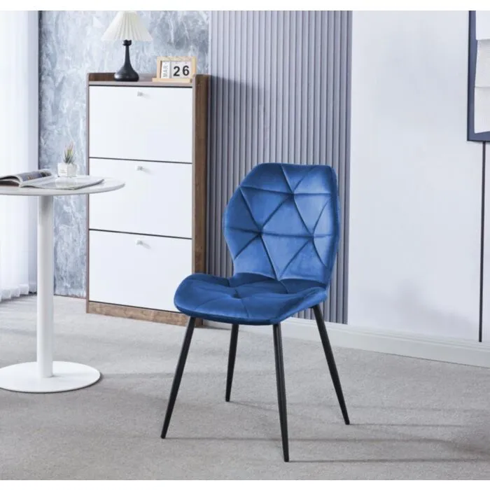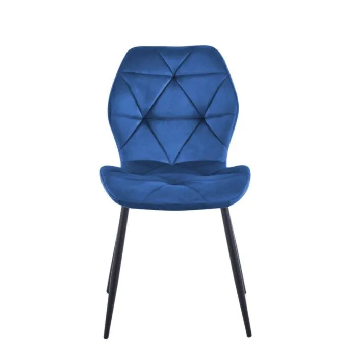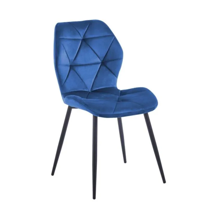 Kuhinjski stol VERACE velvet moder je privlačen in kvaliteten stol za vašo jedilnico s kovinskim črnim podnožjem. Kombinacija modrega prešitega blaga s črnimi kovinskimi nogami ustvari eleganco in lahkotnost. Noge so prašno barvane s debelino profila 1,2 mm. Profiliran naslon omogoča optimalen položaj sedenja ter udobje. Prešiti vzorec pa okrepi tkanino oblazinjenja in ustvari dodatno eleganco.