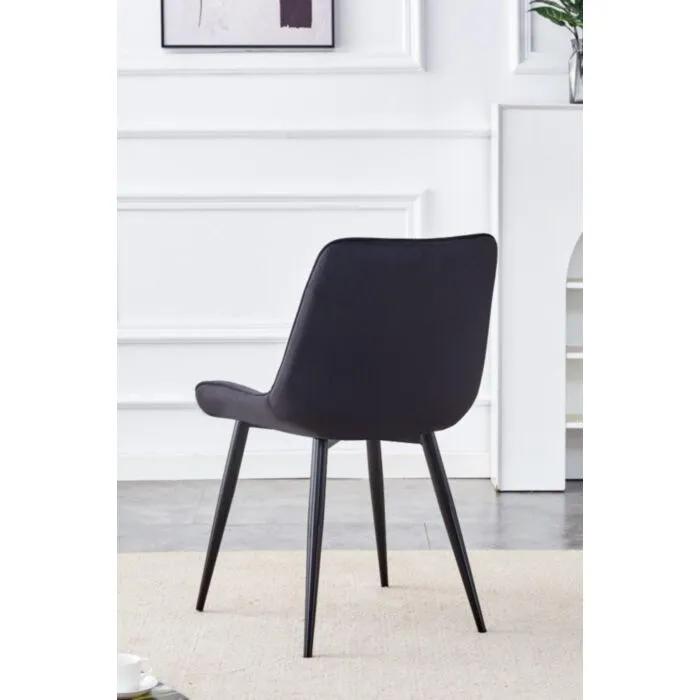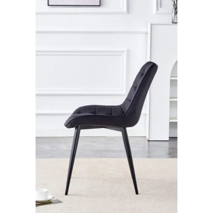 Kuhinjski stol VIKA velvet črna je odlična rešitev za kombiniranje v minimalističen ali industrijski stil prostora. Kombinacija črnega prešitega blaga s črnimi kovinskimi nogami ustvari eleganco in lahkotnost. Noge so prašno barvane z debelino profila 1,2 mm. Profiliran naslon omogoča optimalen položaj sedenja ter udobje. Prešiti vzorec pa okrepi tkanino oblazinjenja in ustvari dodatno eleganco.