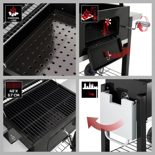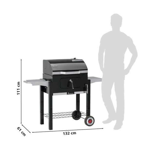Zaradi prostora za shranjevanje pod žarom boste vedno imeli na razpolago oglje za žar. Ob strani žara je prezračevalna luknja, s katero vplivate na pretok zraka in s tem na stopnjo gorenja. Zahvaljujoč dvema kolesoma in kromiranemu ročaju lahko žar enostavno prevažate po terasi ali vrtu.