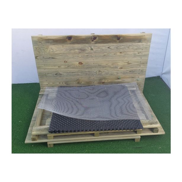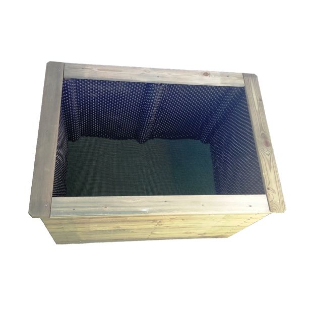 Greda iz globinsko impregniranega lesa, priložena je potrebna kvadratura gumbaste folije za zaščito stranic, pocinkana mreža 5/5 mm za zaščito dna in žičniki-tapetniki 2,8×20 za montažo.