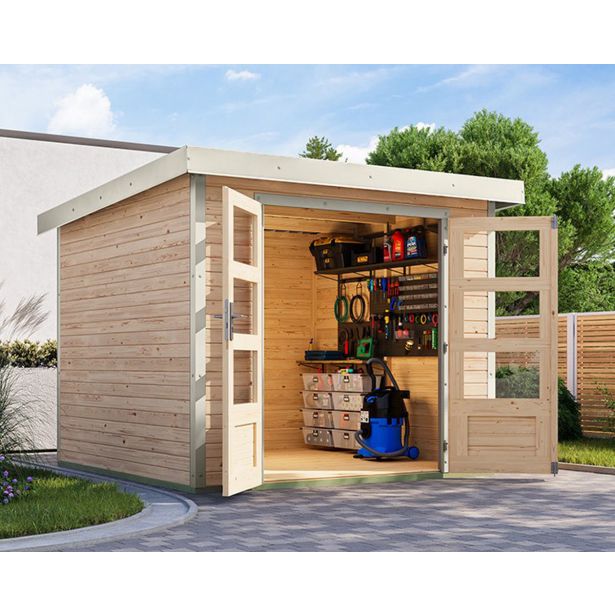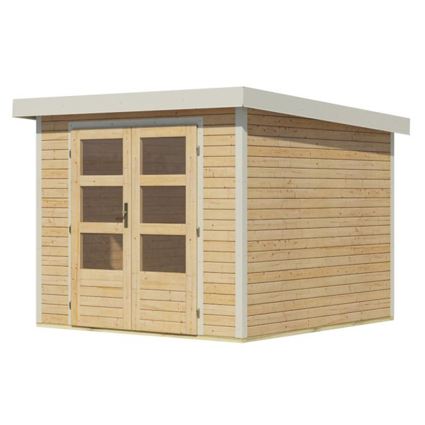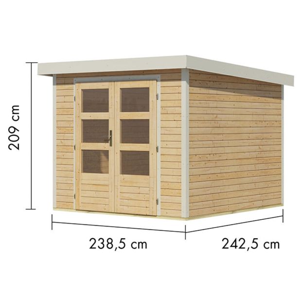 Vrtna hišica Karibu Hybrid Jupiter 3,5 A – 19 mm elementna hišica – lopa za orodje – pritlikava streha – naravna/bela