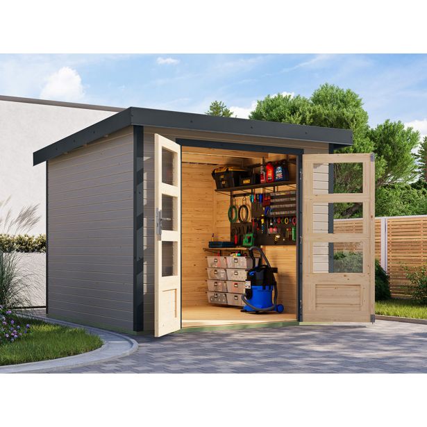 Vrtna hišica Karibu Hybrid Jupiter 3,5 D – 19 mm elementna hišica – lopa za orodje – pritlikava streha – vodno siva/antracitna