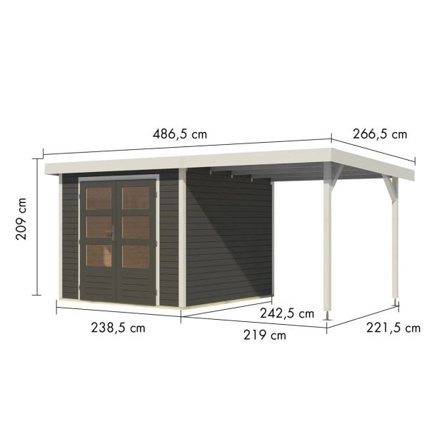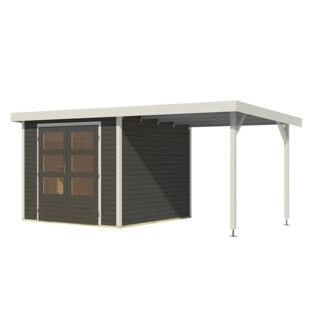 Vrtna hišica Karibu Hybrid Jupiter 3,5 B + 2,4 m prizidek – 19 mm montažna hiša – lopa za orodje – pritlikava streha – terra siva/bela
