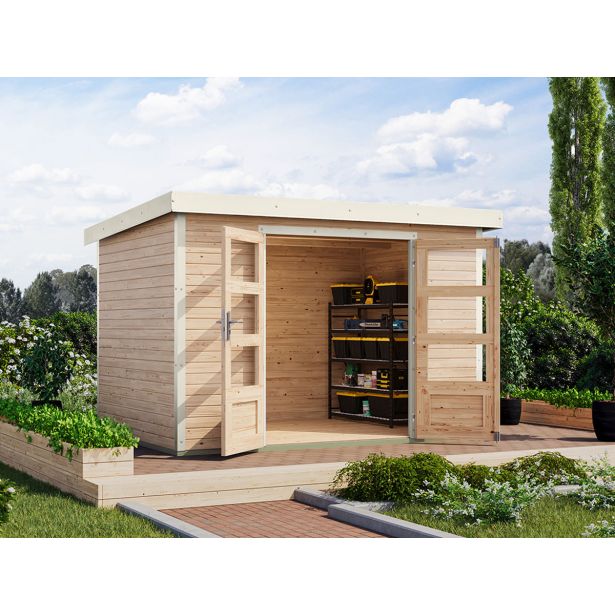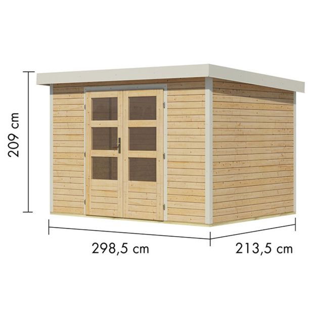Vrtna hišica Karibu Hybrid Jupiter 4 A – 19 mm elementna hišica – lopa za orodje – pritlikava streha – naravna/bela