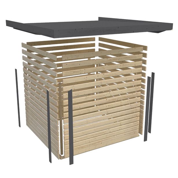 Antracitna streha je izdelana iz pocinkane trapezoidne pločevine . Prednost tega materiala je, da prenese visoke obremenitve, je trajno odporen na vremenske vplive in ponuja zelo dolgo življenjsko dobo. Visokokakovostne jeklene vogalne plošče ščitijo les in hkrati zmanjšujejo stroške vzdrževanja te vrtne lope.