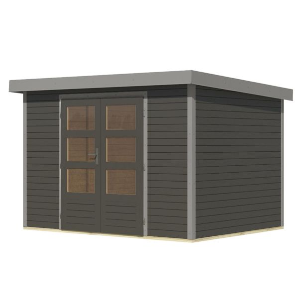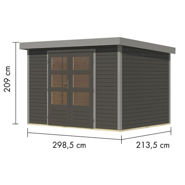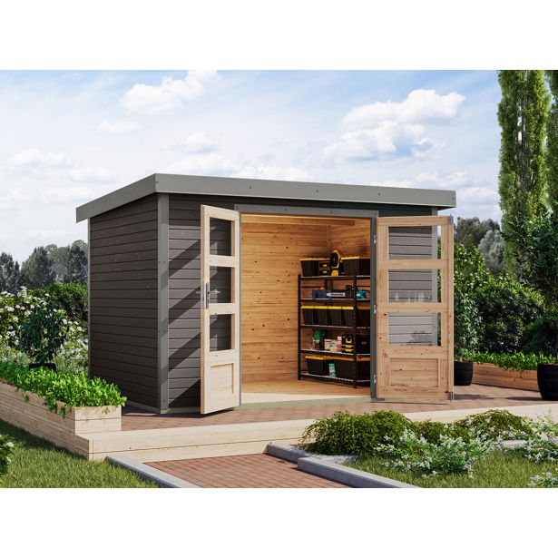 Vrtna hišica Karibu Hybrid Jupiter 4 B – 19 mm elementna hišica – lopa za orodje – pritlikava streha – terra siva/siva