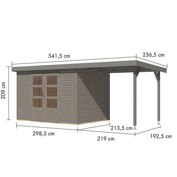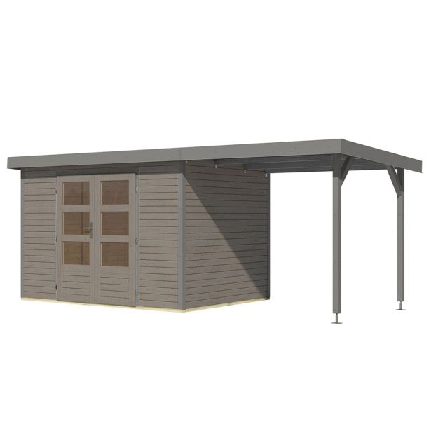 Vrtna hišica Karibu Hybrid Jupiter 4 D + 2,4 m prizidek – 19 mm montažna hiša – lopa za orodje – pritlikava streha – vodno siva/siva