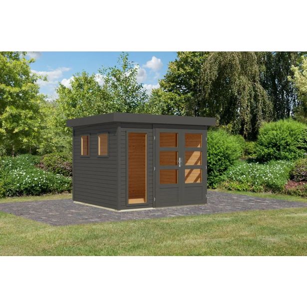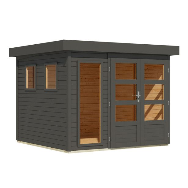 Lesena vrtna hišica Karibu Lahar 3,5 – 19 mm montažna hiša – lopa za orodje – ravna streha – terra siva