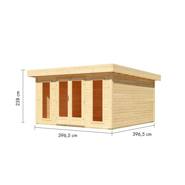 Karibu vrtna hiša Lotus z zelenim strešnim kompletom v naravni izvedbi v 38 mm vtičnem/vijačnem sistemu, vključno z modernimi zelo visokimi dvokrilnimi vrati s cilindrično ključavnico, streho iz masivnega lesa in okovjem.