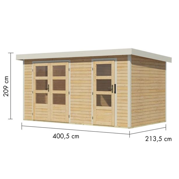 Karibu hibridna vrtna hiša Merkur A – 19 mm montažna hiša – 2-sobna vrtna hiša – enokrilna streha – naravna/bela