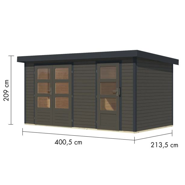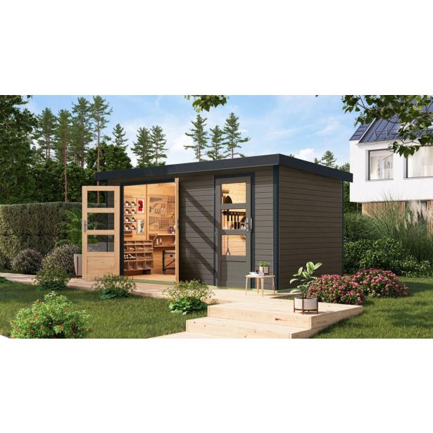 Karibu hibridna vrtna hiša Merkur B – 19 mm montažna hiša – 2-sobna vrtna hiša – enokrilna streha – terra siva/antracit