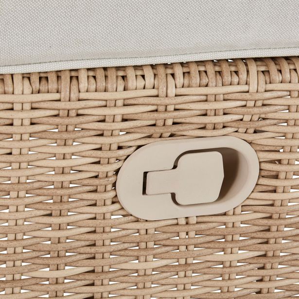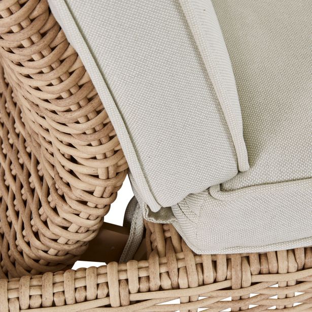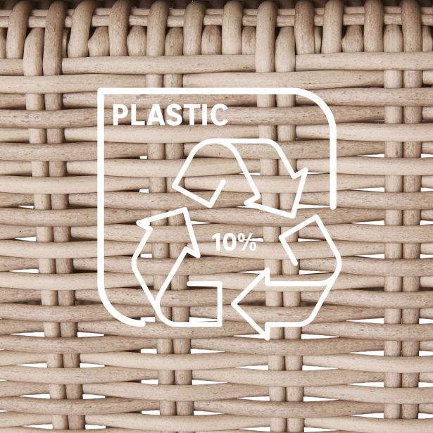 Njegovo tkanje, navdihnjeno z naravnim ratanom, ima polkrožno obliko, ki nudi prijeten in realističen občutek na dotik. Material je odporen na UV žarke in vlago, kar zagotavlja dolgotrajno uporabo. Blazina, izdelana iz mehkega poliestra, nudi prijetno udobje. Obdelana je s protisunčnim in vodoodpornim premazom, ki preprečuje hitro bledenje ter omogoča enostavno čiščenje morebitnih madežev.