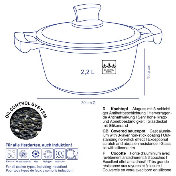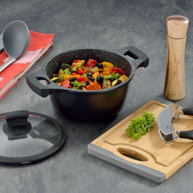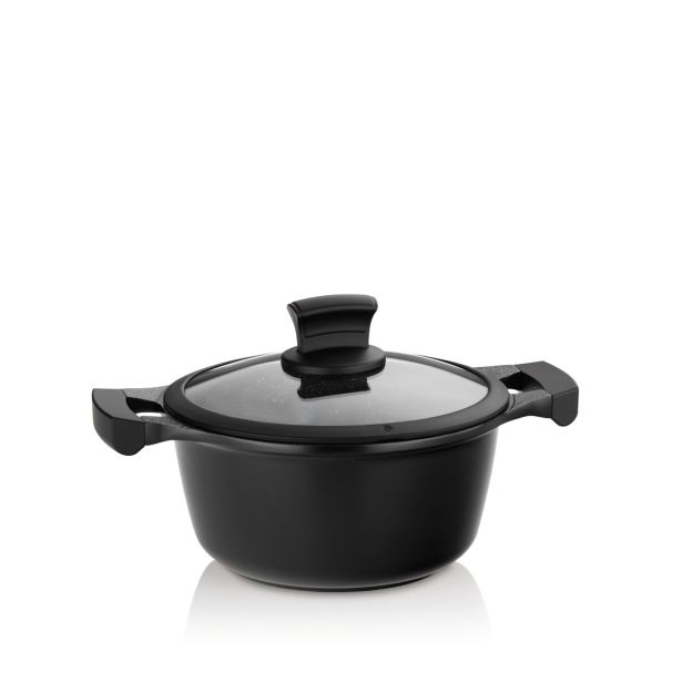 Lonec Stella Nova s ??pokrovom iz litega aluminija, s prostornino 2,2L in premerom 20 cm, je odlična izbira za vse kuharske navdušence, ki želijo izpopolniti svoje kulinarične sposobnosti. Ta lonec črne barve ne bo samo estetsko obogatil vaše kuhinje, temveč bo poskrbel tudi za vrhunsko delovanje pri pripravi obrokov. Ena od ključnih lastnosti tega lonca je posebna površinska obdelava, ki omogoča sistem za nadzor olja. Ta inovativen pristop vam omogoča, da zmanjšate količino uporabljenega olja ali maščobe, hkrati pa uživate v enakomernem namazu. Robustna prevleka proti prijemanju zagotavlja enostavno serviranje, skrajša čas čiščenja in omogoča pripravo bolj zdravih obrokov. Dno lonca je opremljeno z energijsko varčnim podstavkom iz nerjavečega jekla, ki občutno skrajša čas segrevanja. Zaradi te funkcije je lonec združljiv z vsemi vrstami štedilnikov, vključno z indukcijskimi kuhališči, zaradi česar je izjemno vsestranska možnost za vsako kuhinjo. S tem loncem postane kuhanje preprosto in učinkovito. Ne glede na to, ali pripravljate okusne enolončnice, juhe ali zelenjavo, njegova velika zmogljivost in robustna konstrukcija zagotavljata popolne rezultate vsakič.