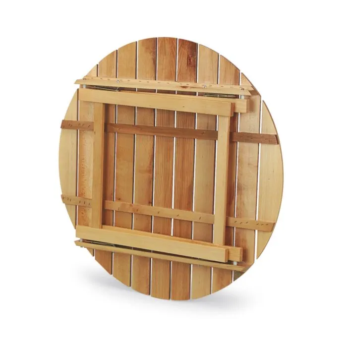 Miza BASS dimenzije fi 100 cm , narejena v celoti iz naturalnega lesa. Zaščitena je z lakom. Primerna za pokrite terase, balkone, vikendice, kamp prikolice, odlična kot pomožna miza doma.  Ko odrabite mizo jo enostavno zložite in pospravite. Miza ne sme biti izpostavljena dežju in snegu.