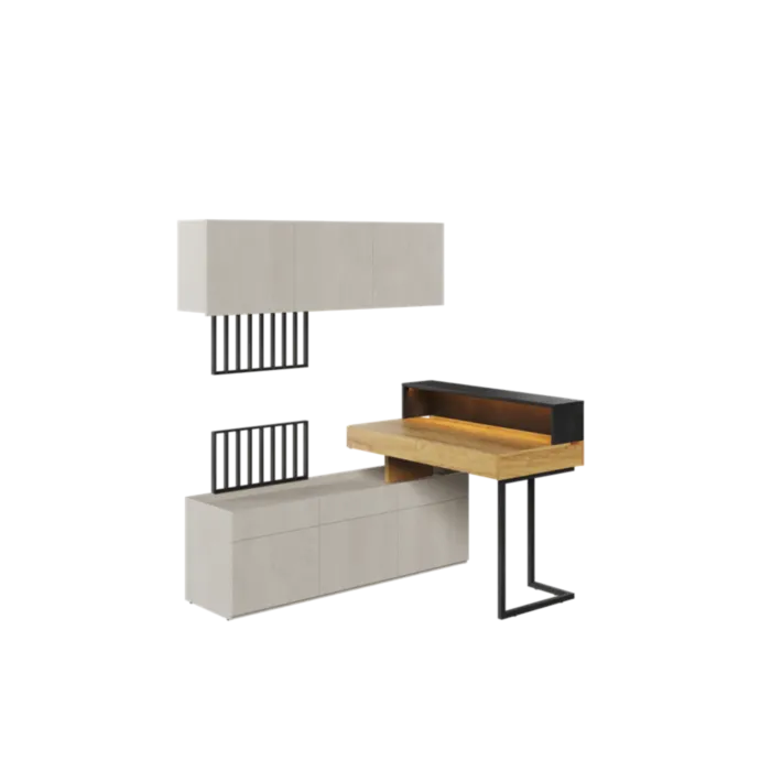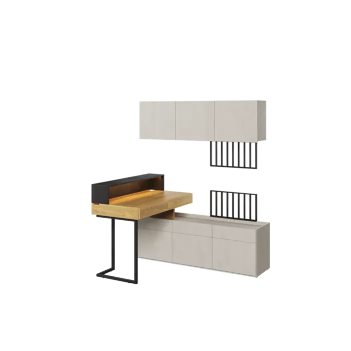 Mladinska soba SIMPL 6 je odlična ponudba za tiste, ki želijo sobo urediti v dizajnerskem in brezčasnem stilu. Komplet je sestavljen iz petih elementov: 1 x pisalna miza (Šolska miza v mladinski sobi je element, ki ga pri urejanju prijaznega učnega prostora ne gre izpustiti. Mladinska pisalna miza s predali iz kolekcije SIMPL ima delovno ploščo ergonomske velikosti. Pohištvo je naslonjeno na vitke noge, ki mu dajejo lahkotnost), 1 x Namizni podaljšek z LED (Popoln za prikaz monitorja, dodatne svetilke ali vaših najljubših okraskov na vrhu. Opremljen je z modno LED osvetlitvijo energične barve, ki poudarja sodoben značaj pohištva), 1 x Set 3 spodnjih omaric (Moderna omara za mladinsko sobo s tremi vrati. V notranjosti skriva funkcionalno razporeditev polic, ki bo poskrbela za lažji red. Kos pohištva je opremljen s spuščenim zgornjim delom, zahvaljujoč kateremu so izpostavljene stvari na njegovi površini zaščitene pred padci. Uspešno jo lahko uredimo na primer kot TV omaro), 1 x set 3 visečih omaric (Modna viseča omarica za mladinsko sobo s tremi vrati vam omogoča, da stenski prostor izkoristite za shranjevanje na zanimiv način. Odlično se bo obnesel, če bo visel nad drugim pohištvom iz kolekcije, na primer nad pisalno mizo. Notranjost nudi praktično razporeditev polic, ki olajšajo urejenost knjig, iger ali drugih šolskih potrebščin. Dodatne prednosti, ki bloku dajejo minimalističen slog, so fronte brez ročajev. Omarica na steno je odlična rešitev za majhne prostore, kjer želimo čim bolj prihraniti prostor) ter 1 x TV panel (Dizajnerska in izjemno modna TV plošča v obliki lamel z vgrajeno LED osvetlitvijo energijsko oranžne barve).
