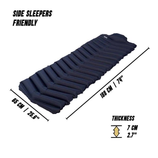 Ne glede na to, kam greš, lahko tja prideš z več udobja in veselja, če s seboj spakiraš svojo blazino LAYON. Ta blazina se napihne v nekaj sekundah, tako da ti ni več treba trpeti mrzle noči na trdih, neprizanesljivih tleh. Prav tako hitro se tudi izprazni. Presenečen boš, kako majhno se zloži.