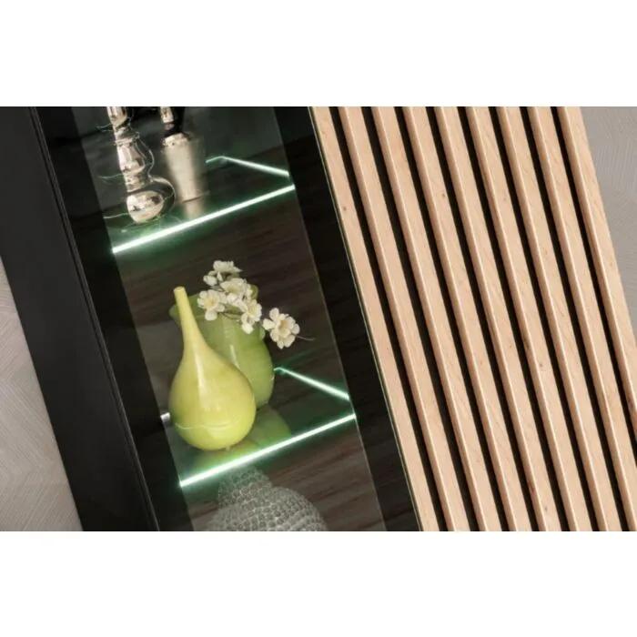 Nizka vitrina KAMERON je elegantna ter atraktivna. Moderen dizajn z dodatki, črnega stekla ter lamelami v svetlem hrastu, se bo podal v vsak prostor. Vitrina ima kombinacijo črnega stekla katera vsebuje steklene police. Katere imajo še dodatno led osvetlitev.