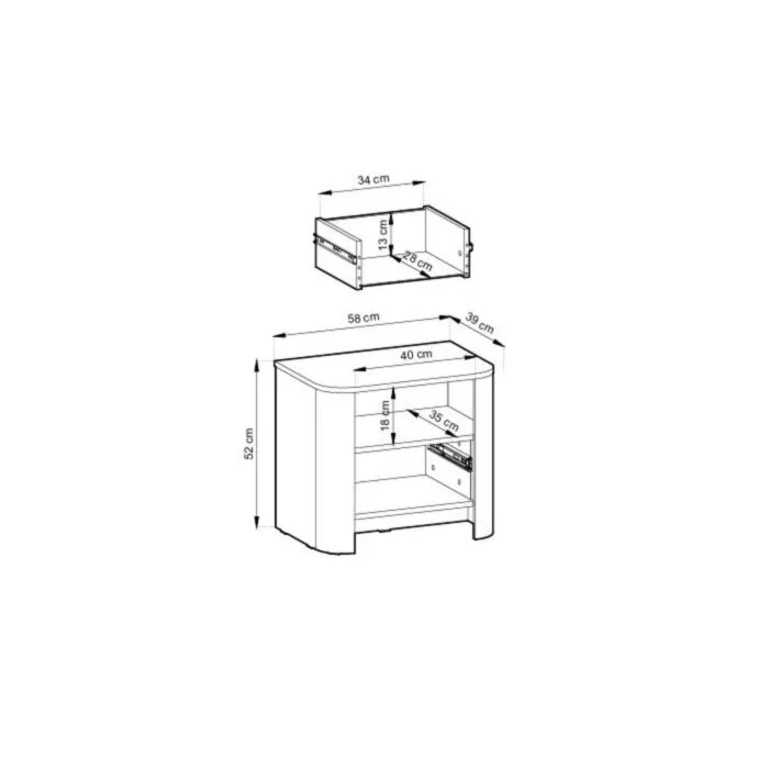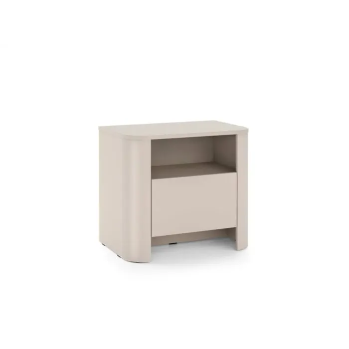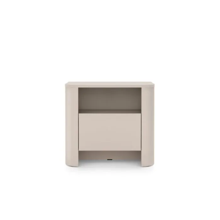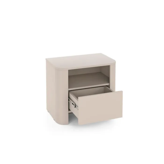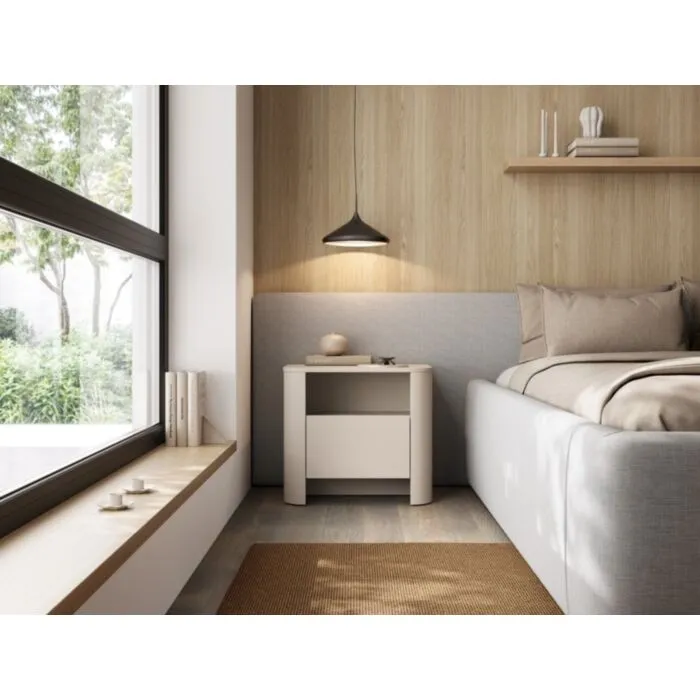Estetsko se poda v vsak prostor ter ima dobro odpornost na madeže in vlago. Ima ABS robove, ki zagotavljajo večjo odpornost proti udarcem, vlagi in obrabi ter podaljšujejo njeno življenjsko dobo. ABS robovi ne le ščitijo pred poškodbami, ampak poskrbijo tudi za lepši in elegantnejši videz pohištva. Dodatna prednost nočne omarice je njena prostornost, vanjo lahko spravite veliko stvari in s tem poskrbiste za dodatno organizacijo in urejenost. Ima sistem odpiranja “PUSH TO OPEN”, kar zagotavlja enostavno odpiranje in zapiranje omarice, brez da bi imela nepotrebne ročaje.