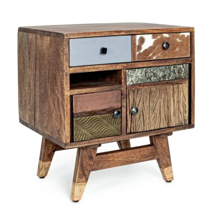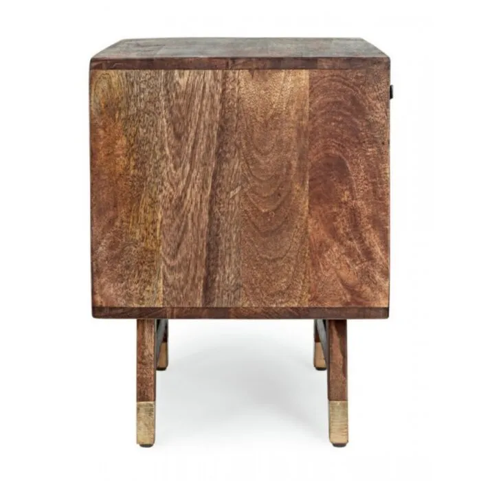 Nočna omarica DHAVAL ima okvir iz lesa in MDF-ja. Ima jeklene ročaje.