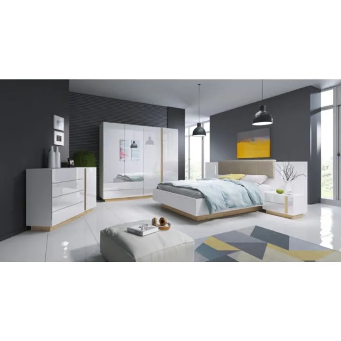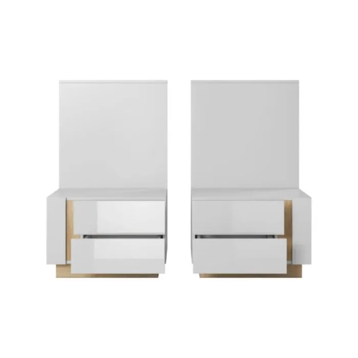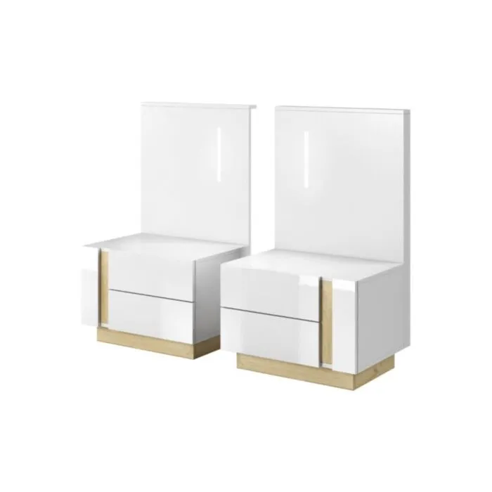 Moderno eleganten dizajn nočne omarice NANCY z LED razsvetljavo. Narejena iz odličnih materialov v bela visoki sijaj/hrast dekorju. Odlično se podata k postelji NANCY.
