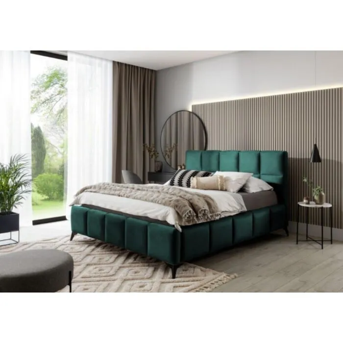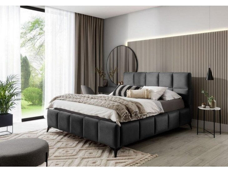 Prešit material krasi posteljo, dodaja stil ter značaj in prinaša pridih modernosti. Črne kovinske noge dolžine 14 centimetrov poskrbijo, da postelja navidezno lebdi nad tlemi, kar dodatno optično poveča prostor v katerem bo postelja ANGELINA . Poleg tega je postelja opremljena tudi s posodo za posteljnino, ki je zelo dobra rešitev za majhne prostore in vam omogoča, da poskrbite za red v spalnici.
