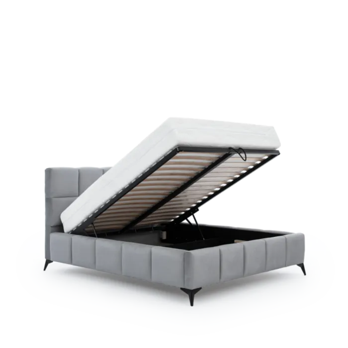 Prešit material krasi posteljo, dodaja stil ter značaj in prinaša pridih modernosti. Črne kovinske noge dolžine 14 centimetrov poskrbijo, da postelja navidezno lebdi nad tlemi, kar dodatno optično poveča prostor v katerem bo postelja ANGELINA . Poleg tega je postelja opremljena tudi s posodo za posteljnino, ki je zelo dobra rešitev za majhne prostore in vam omogoča, da poskrbite za red v spalnici.